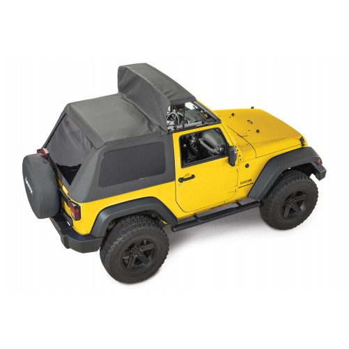 Introducing Quadratecs exclusive QuadraTop Adventure® Top S™ with Fold Back Sunroof! Includes all the great features as the Adventure® Top with the addition of a retractable sunroof! The Adventure Top S is specifically designed for the JK 2-door, and comes complete with every bit of hardware including door surrounds, tailgate bar, windshield header, fabric top and windows to complete the installation. The Adventure Top S features an easy-to-use fold back sunroof section providing quick open air enjoyment for the front seats. The Adventure Top S folds back even with the windows removed making it the ultimate flip back Bimini top! The Adventure Top S with fold-back sunroof is a patent pending design thats easily engaged by simply stopping the vehicle; unlatching the two header clamps and folding it back! You can have open air driving in a matter of seconds! The Adventure Top S will provide lasting durability and unique restyling with the ride comfort you want and protection from the elements that you need. The Adventure Top S may not be compatible with some hood deflectors when the sunroof is in the open position without the use of Velcro retaining straps.